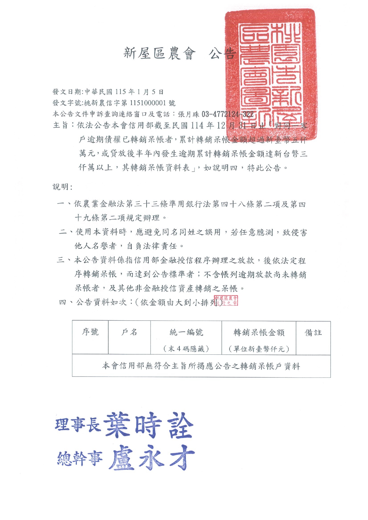 • 桃園市新屋區農會信用部履行個人資料保護法第八條第一項告知義務 (放款)